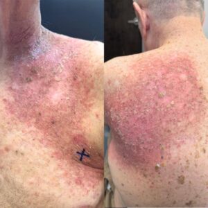 A male in his mid-seventies undergoing treatment for metastatic squamous cell carcinoma presented with progressive redness, irritation, and skin breakdown over the left chest extending to the upper back. These areas corresponded precisely to prior radiation treatment fields. He reported burning discomfort, increased sensitivity, and worsening dryness over several weeks. There were no systemic symptoms such as fever or chills.